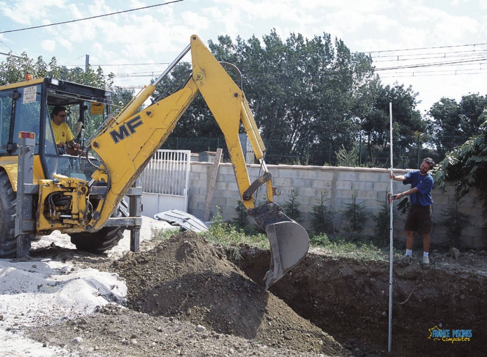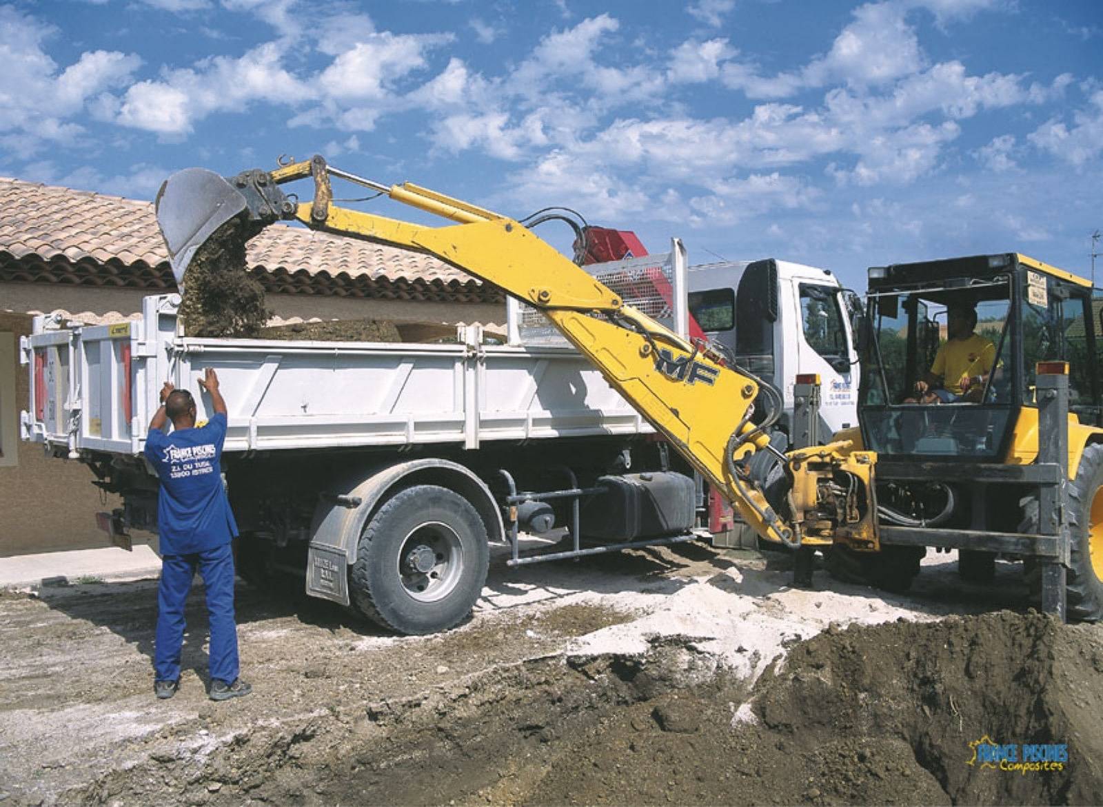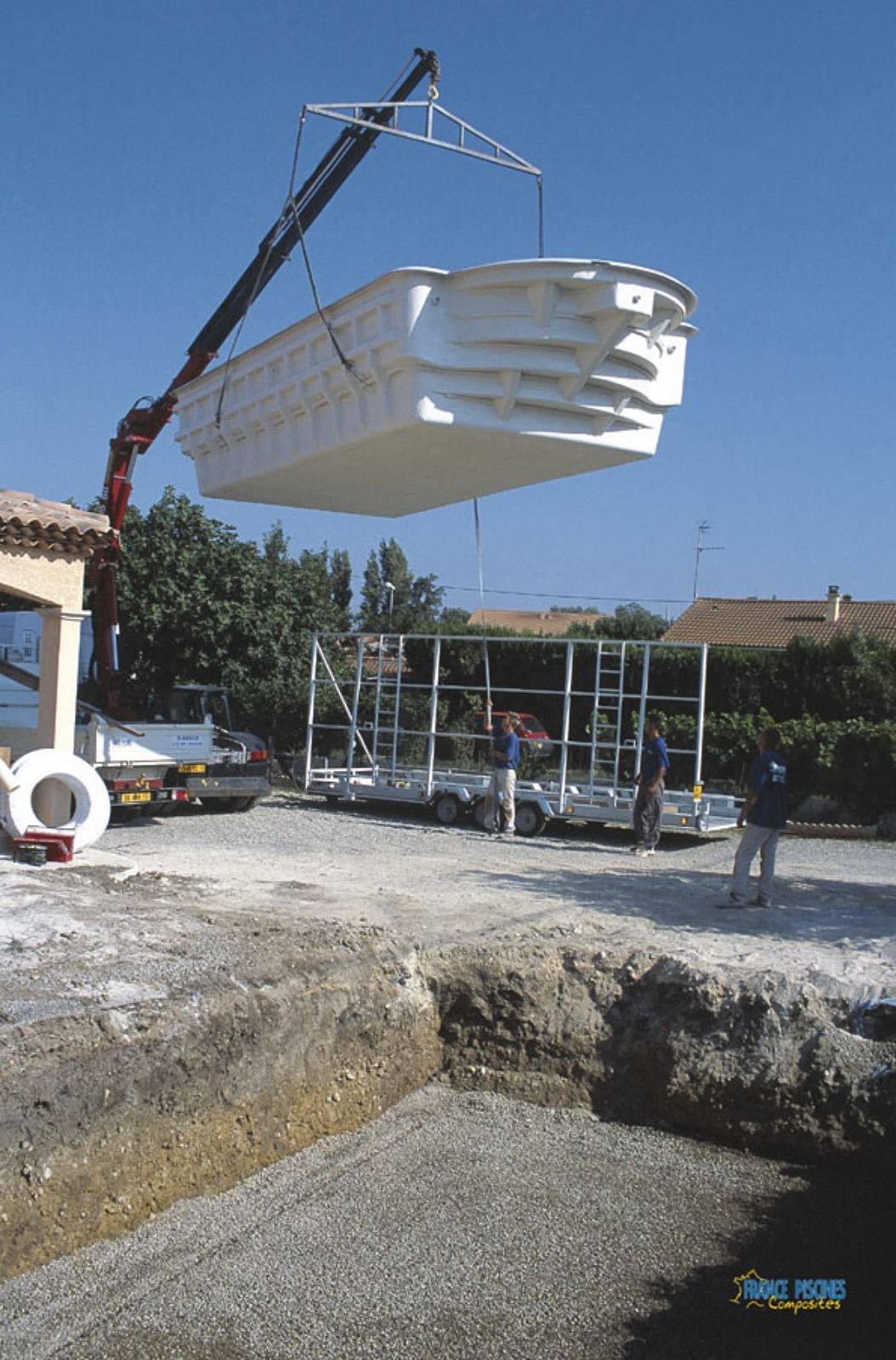 Le terrassement consiste à creuser la fosse aux dimensions exactes de la coque, en prévoyant un espace supplémentaire pour le remblai. Le fond est ensuite nivelé et recouvert d’un lit de sable stabilisé ou de gravier, surmonté d’un géotextile pour assurer la stabilité.
